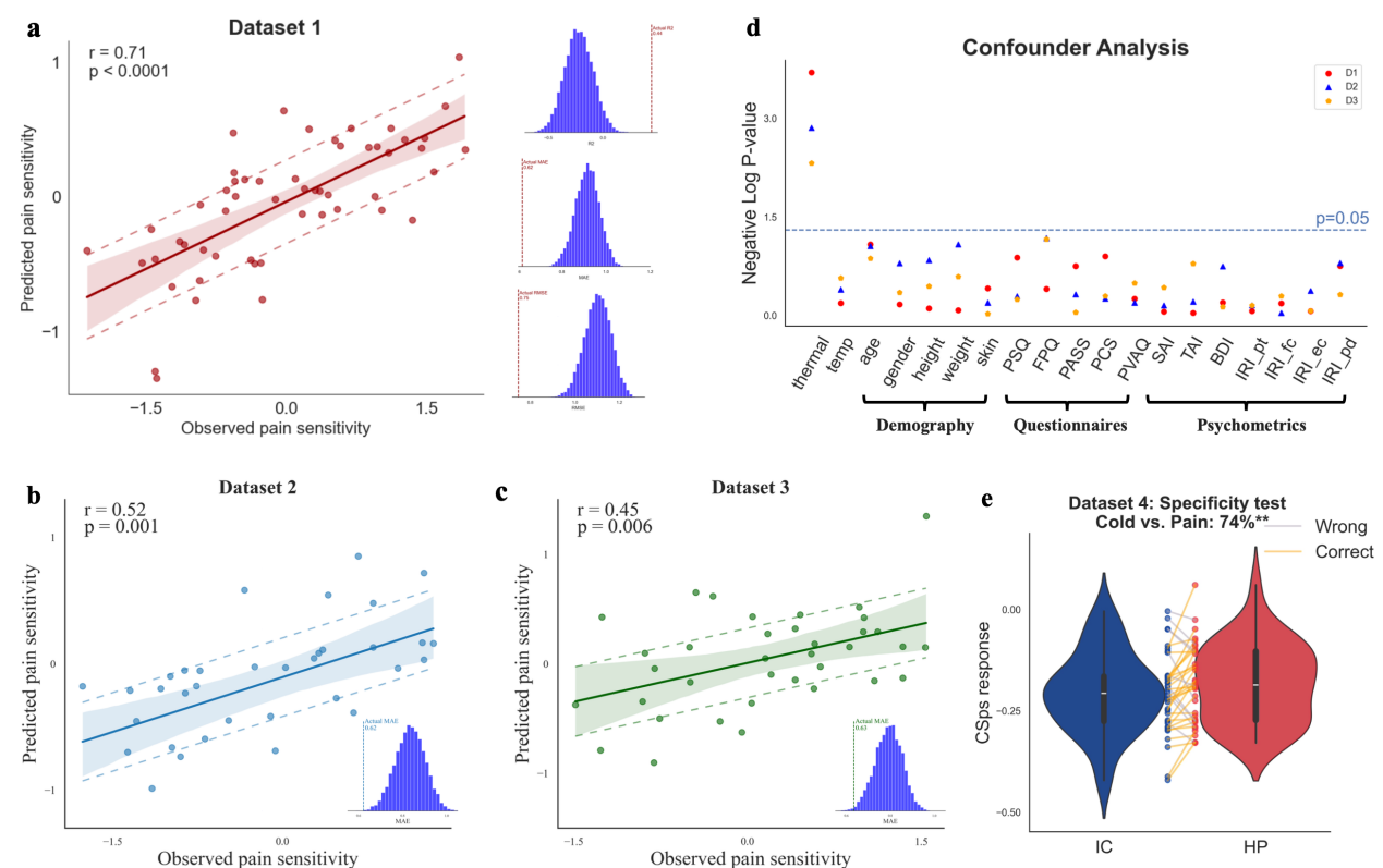 该研究首先基于健康参与者的静息态皮层-脊髓功能连接数据,结合机器学习算法构建了CSps模型。研究发现,CSps能够准确预测个体的热痛阈值,并在多个独立的外部数据集中表现出优异的泛化能力(图1a-c)。此外,该模型具有良好的疼痛特异性,能够有效区分疼痛与非疼痛(如冷感觉)的神经反应(图1e),且不受个体焦虑、抑郁等心理因素及人口学变量的影响(图1d)。