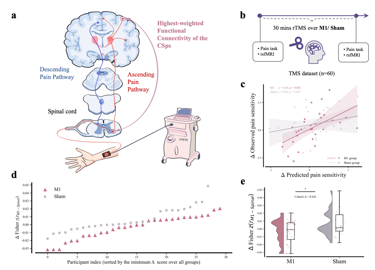 从模型结构看,CSps由一组稀疏连接构成,其中最突出的正向预测通路之一,是运动皮层与颈髓C4腹角之间的连接,形成一条“从皮层到脊髓的纵向整合轴”。基于这一模型指向性证据,研究团队进一步设计了关键的“调控-反馈”环节:在经伪刺激对照的10 Hz重复经颅磁刺激(rTMS)实验中,对M1进行定向扰动,并在刺激前后采集皮层-脊髓静息态成像及疼痛任务数据。结果显示,在真实M1刺激组中,CSps评分变化与疼痛感知变化显著相关(r=0.55),而伪刺激组不显著(图3d-e);同时,运动区-脊髓关键连接也出现与刺激相关的改变(图3c)。